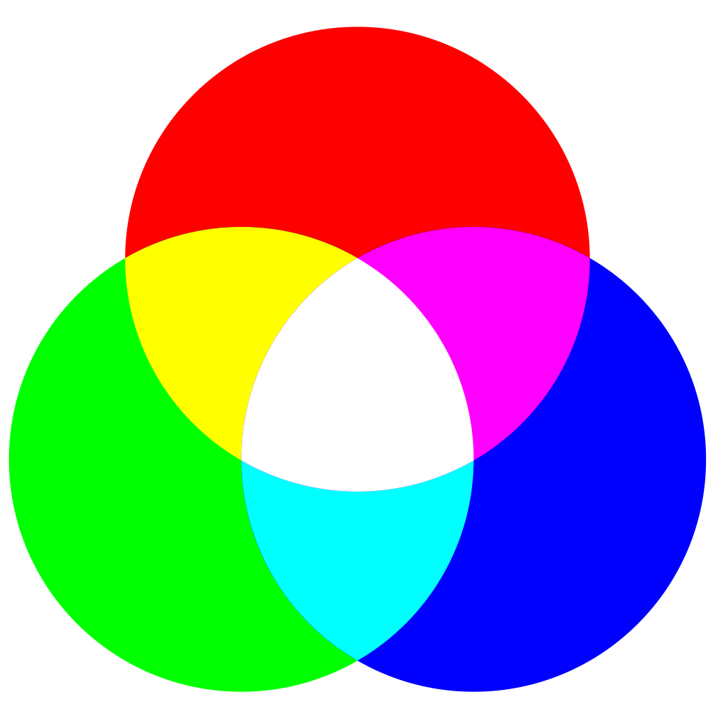 RGB模型中的三原色指的是红色(Red)、绿色(Green)和蓝色(Blue)。 这三种颜色可以通过不同的亮度和强度混合,形成几乎所有的颜色。 RGB色彩混合遵循加色原理。 当红、绿、蓝三种颜色的光线以不同比例混合时,会形成新的颜色。 例如,红色和绿色光线混合会形成黄色,红色和蓝色混合会形成洋红色,绿色和蓝色混合会形成青色。 当三种颜色的光线以最大强度混合时,会形成白色。